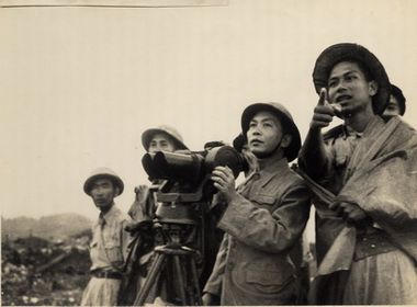 Đại tướng Võ Nguyên Giáp quan sát tình hình mặt trận, năm 1954. Nguồn Trung tâm Lưu trữ quốc gia III, tài liệu ảnh phông Bộ Ngoại giao, SLT3111 - 2769. |