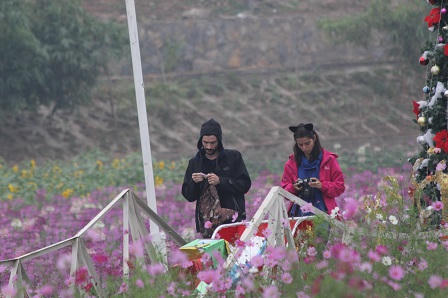 Những ngày cuối năm, thung lũng hoa Hồ Tây trở thành nơi thu hút rất nhiều các bạn trẻ tới chụp ảnh, đặc biệt là những đôi uyên ương dập dìu chụp ảnh cưới.