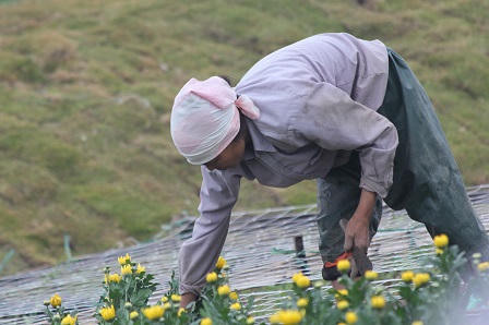 Thời tiết mưa phùn, ẩm thuận lợi cho cây cối nhưng lại khá bất tiện cho người trồng hoa, người phụ nữ này phải mặc áo mưa để làm việc.