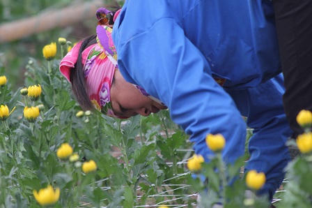 Người phụ nữ này đang trồng từng cây hoa cúc đã ra nụ để tạo nên một luống hoa nở đồng đều.