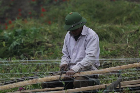 Người đàn ông này đang làm các khung tre để chăng dây tạo các luống hoa thẳng hàng.