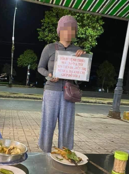 Cô gái trẻ cầm bảng: “Tôi bị bệnh thiếu máu não” để moi tiền. |