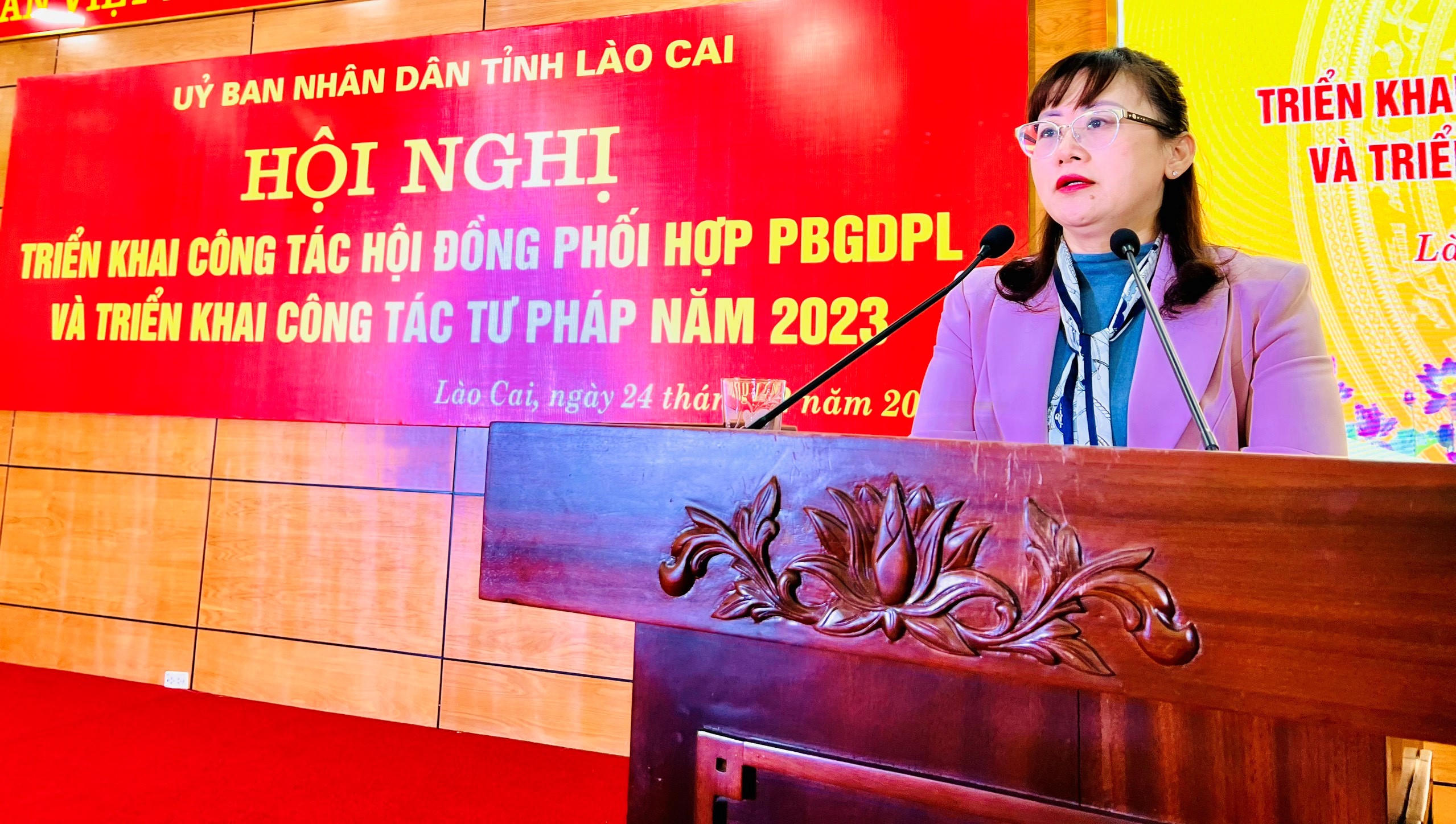 Phát biểu chỉ đạo Hội nghị, bà Giàng Thị Dung, Phó chủ tịch UBND tỉnh, Chủ tịch Hội đồng phối hợp PBGDPL tỉnh Lào Cai đánh giá cao những kết quả mà ngành Tư pháp đạt được và những đóng góp cho sự phát triển kinh tế – xã hội của tỉnh. Đồng thời đề nghị ngành Tư pháp tiếp tục phát huy những kết quả đạt được, khắc phục khó khăn, tồn tại để nâng cao hơn nữa hiệu quả công tác tư pháp, công tác phối hợp PBGDPL trong thời gian tới.
