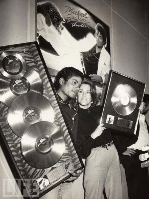 Michael mừng thành công của album “Thriller”. Michael nhận chiếc đĩa bạch kim từ nữ diễn viên Jane Fonda dành cho album thành công nhất vào 25/2/1983. Cho đến tận ngày nay, “Thriller” vẫn là album bán chạy nhất mọi thời đại.