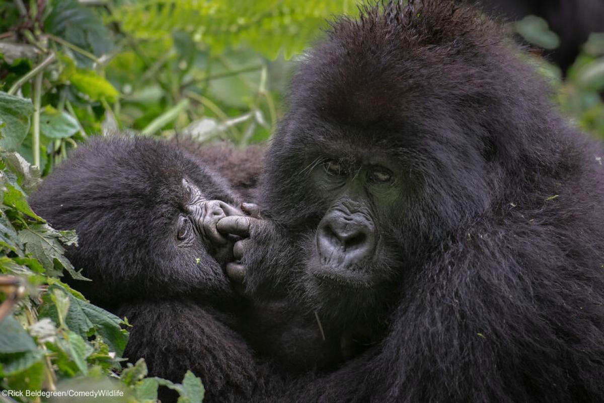 "Sau khi đi bộ khoảng vài tiếng đồng hồ để gặp gia đình khỉ đột này, chúng tôi may mắn thấy một vài chú khỉ đột con trong đàn. Tất cả những trò đùa của chúng đều rất thú vị và hài hước, chẳng hạn như chú khỉ đột con này đang ngoáy mũi khi mẹ của nó không để ý", tác giả của bức ảnh - Rick Beldegreen cho hay.