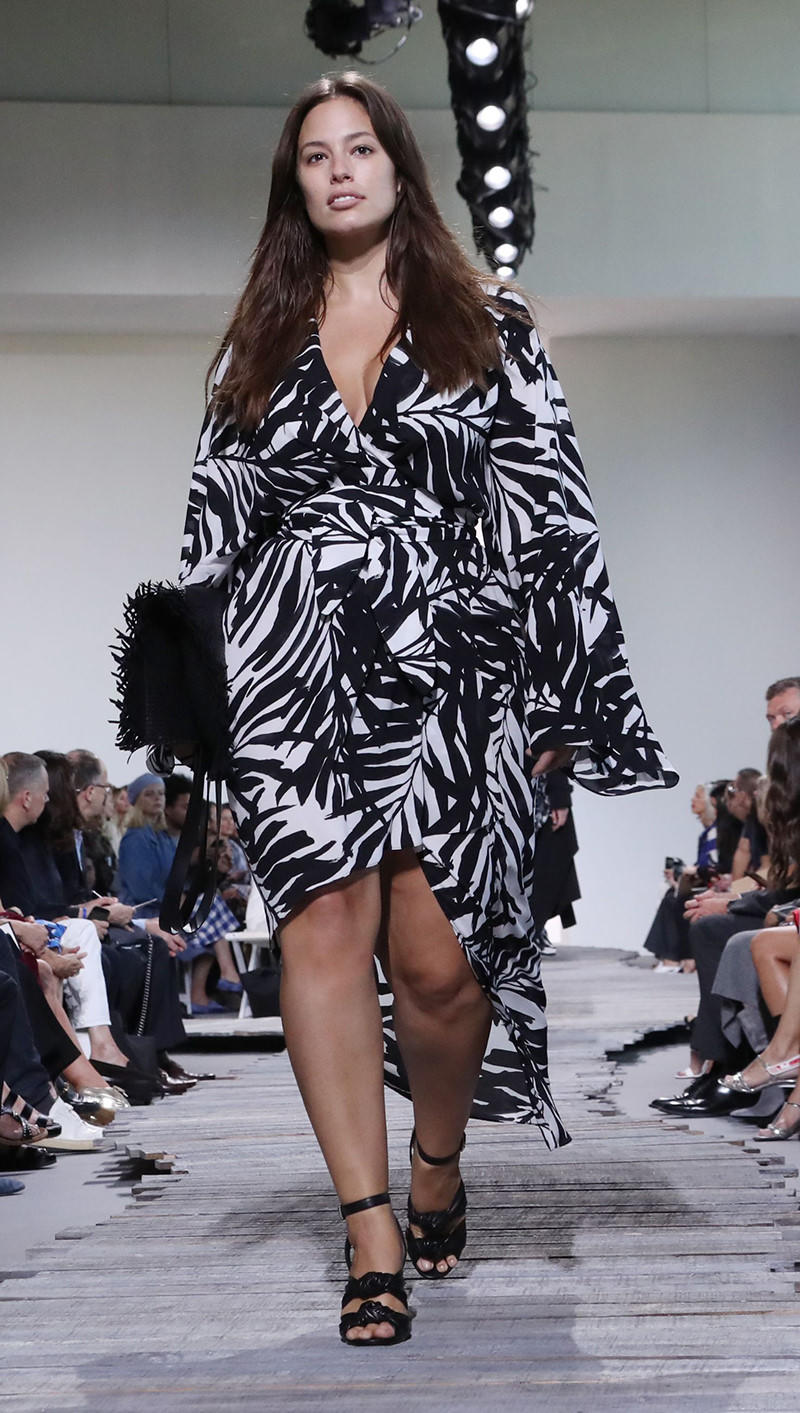 Trên sàn diễn của nhà mốt Michael Kors ở tuần lễ thời trang New York vừa qua, siêu mẫu ngoại cỡ Ashley Graham nổi bật với chiếc váy đắp vạt họa tiết ấn tượng. Chiếc clutch tua rua đen kết hợp ăn ý trong bộ trang phục với hai màu trắng - đen là chủ đạo.