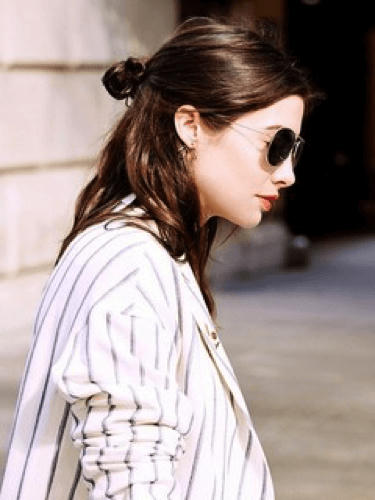 Khác với tóc buộc nửa đơn điệu, kiểu tóc này có phần hiện đại và phá cách hơn. Những bộ trang phục hợp với tóc búi nửa thường là những bộ đầm nữ tính hay những chiếc chân váy bánh bèo.