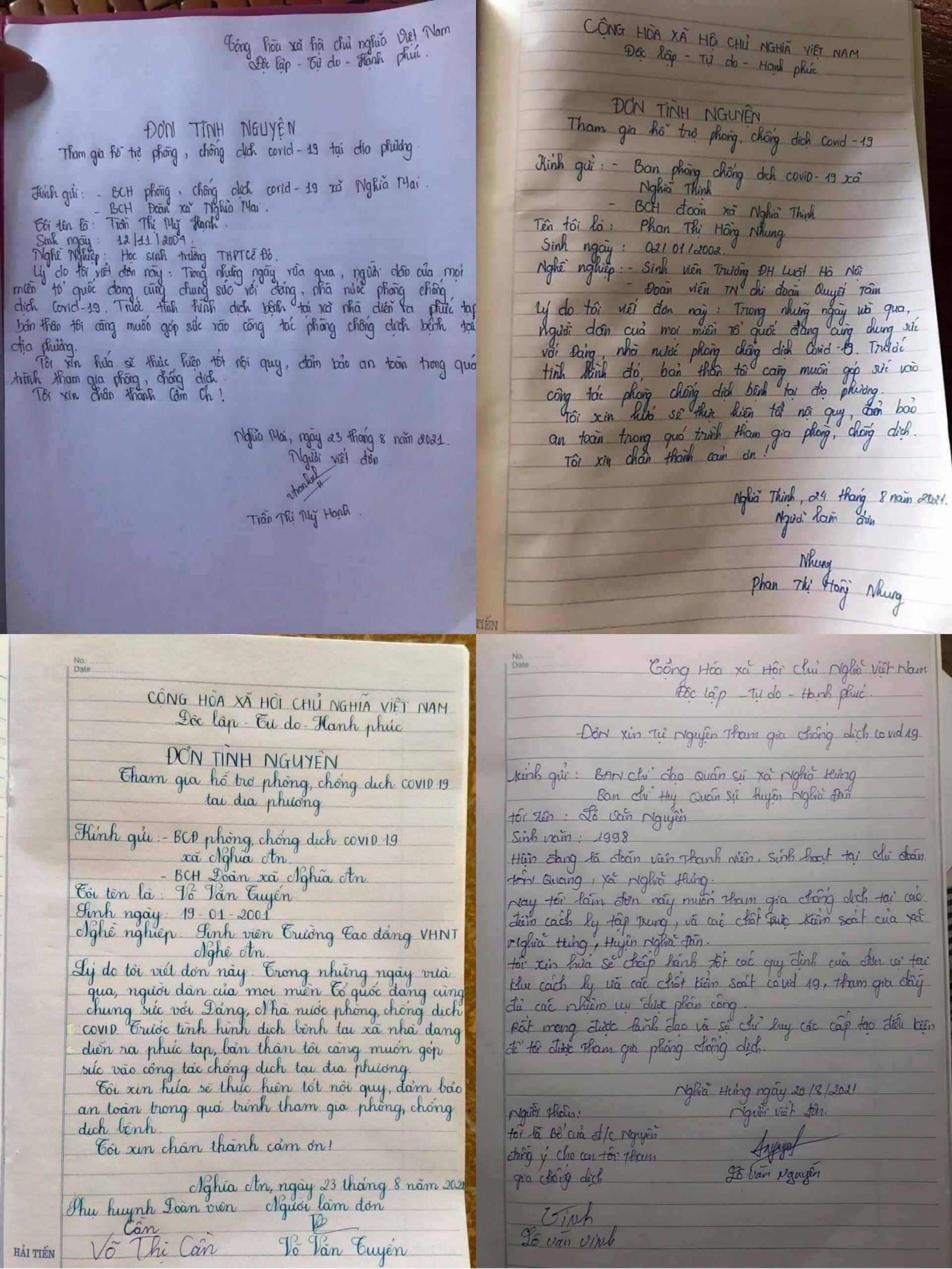 Rất nhiều bạn trẻ tại xã Nghĩa Đàn (Nghệ An) cũng viết đơn xin tham gia các hoạt động trực chốt phòng, chống COVID – 19; đi chợ giúp người dâ; chuẩn bị khu cách ly…