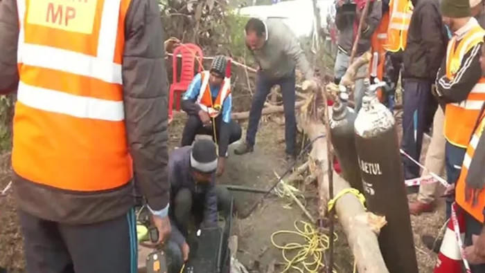 Lực lượng cứu hộ tìm cách giải cứu cậu bé rơi xuống hố ở Madhya Pradesh. Ảnh: Twitter