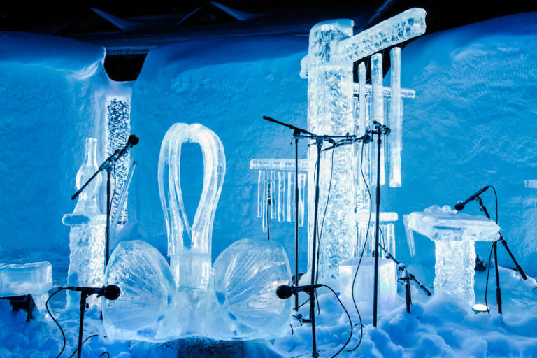 Ice Music Festival, Geilo, Na Uy: Ice Music Festival là một lễ hội băng đá độc đáo ở Geilo, Na Uy. Hàng trăm người yêu âm nhạc và những nghệ sĩ tham gia vào lễ hội này đã đưa điêu khắc đá lên một tầm cao mới. Lễ hội bắt đầu được tổ chức từ năm 1995, vào ngày trăng tròn đầu tiên của năm mới, tất cả các nhạc cụ sử dụng trong các buổi biểu diễn như đàn guitar, violin hay thậm chí là đàn dây đều được điêu khắc từ băng đá. Chất lượng của âm thanh phụ thuộc vào chất lượng của băng và chất lượng của băng phụ thuộc vào nhiệt độ thời tiết. Vì vậy mỗi buổi hòa nhạc là một trải nghiệm độc đáo. Ảnh: Sayhitonorway.