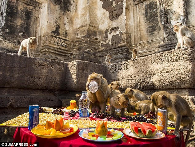 Tiệc buffet cho khỉ, Thái Lan: Những con khỉ sống gần làng Lopburi từng bị xem là điều gây phiền hà với du khách và người địa phương. Tuy nhiên, từ năm 1989, dân làng đã thực hiện một giải pháp lạ lùng cho vấn đề này: một lễ hội thường niên, trong đó người dân quyên góp đồ ăn như trái cây, các loại hạt và cua cho khỉ ăn. Lễ hội này diễn ra vào cuối tuần cuối cùng của tháng 11 hàng năm.