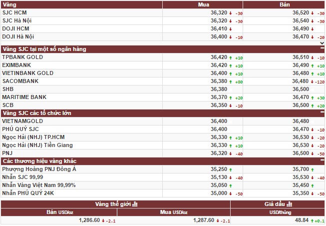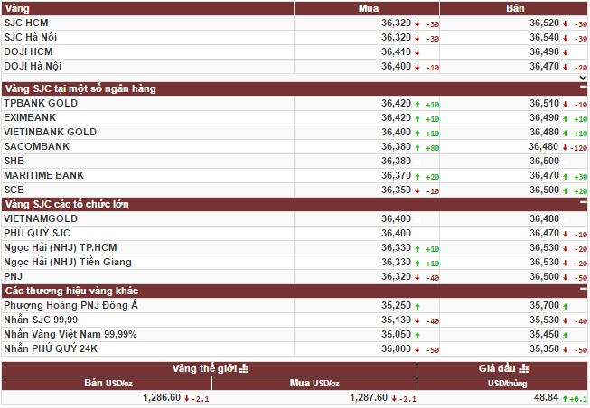 Tại Công ty SJC, giá vàng niêm yết chiều mua vào là 36,32 triệu đồng/lượng, ở chiều bán ra có mức giá là 36,54 triệu đồng/lượng. Tại thị trường TP.HCM, chiều bán ra niêm yết ở mức giá 36,52 triệu đồng/lượng.