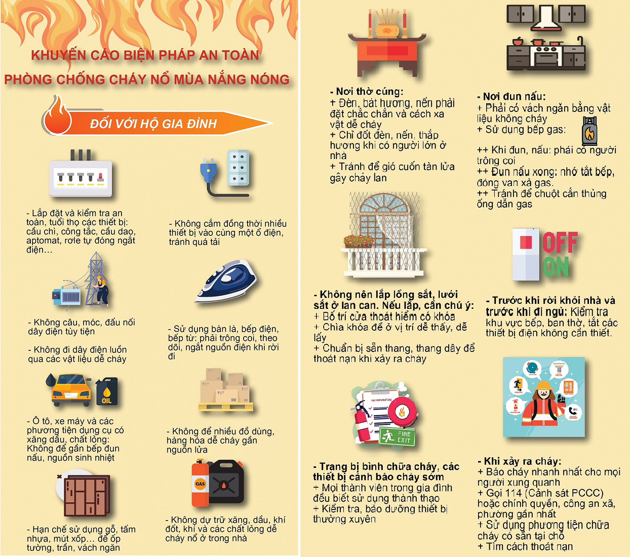 Trước khi rời khỏi nhà và trước khi đi ngủ phải kiểm tra nơi đun nấu, nơi thờ cúng, tắt các thiết bị điện không cần thiết.