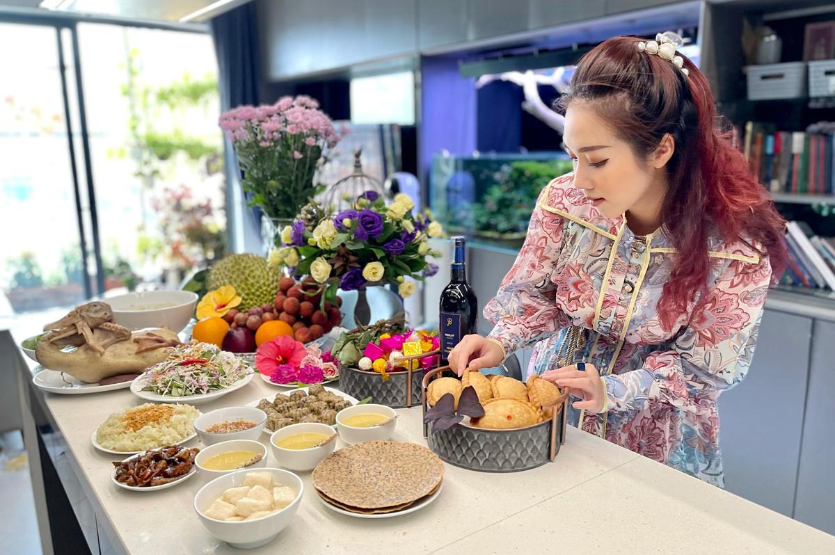 "Mình là con gái xứ Huế, lại làm dâu Sài Gòn nên muốn giữ truyền thống cả hai nơi. Tết mùng 5 của mình hiện tại không thể thiếu thịt vịt luộc chấm mắm gừng, cháo huyết vịt và chè kê xúc bánh tráng mè. Mình cũng theo phong tục nhà chồng có cơm rượu, bánh ú tro và hoa quả chua", Lan Phương nói.