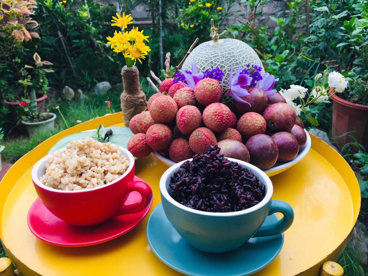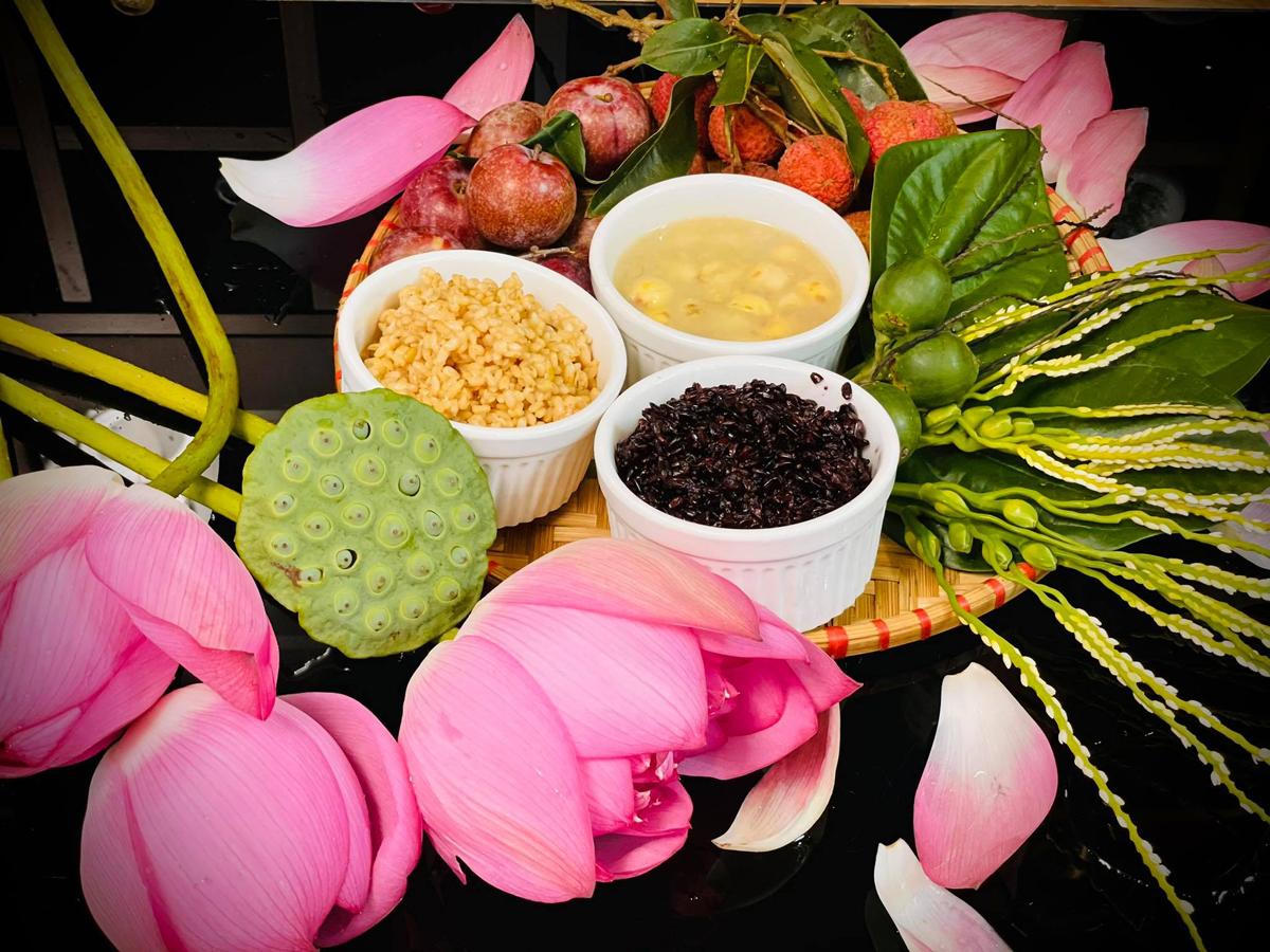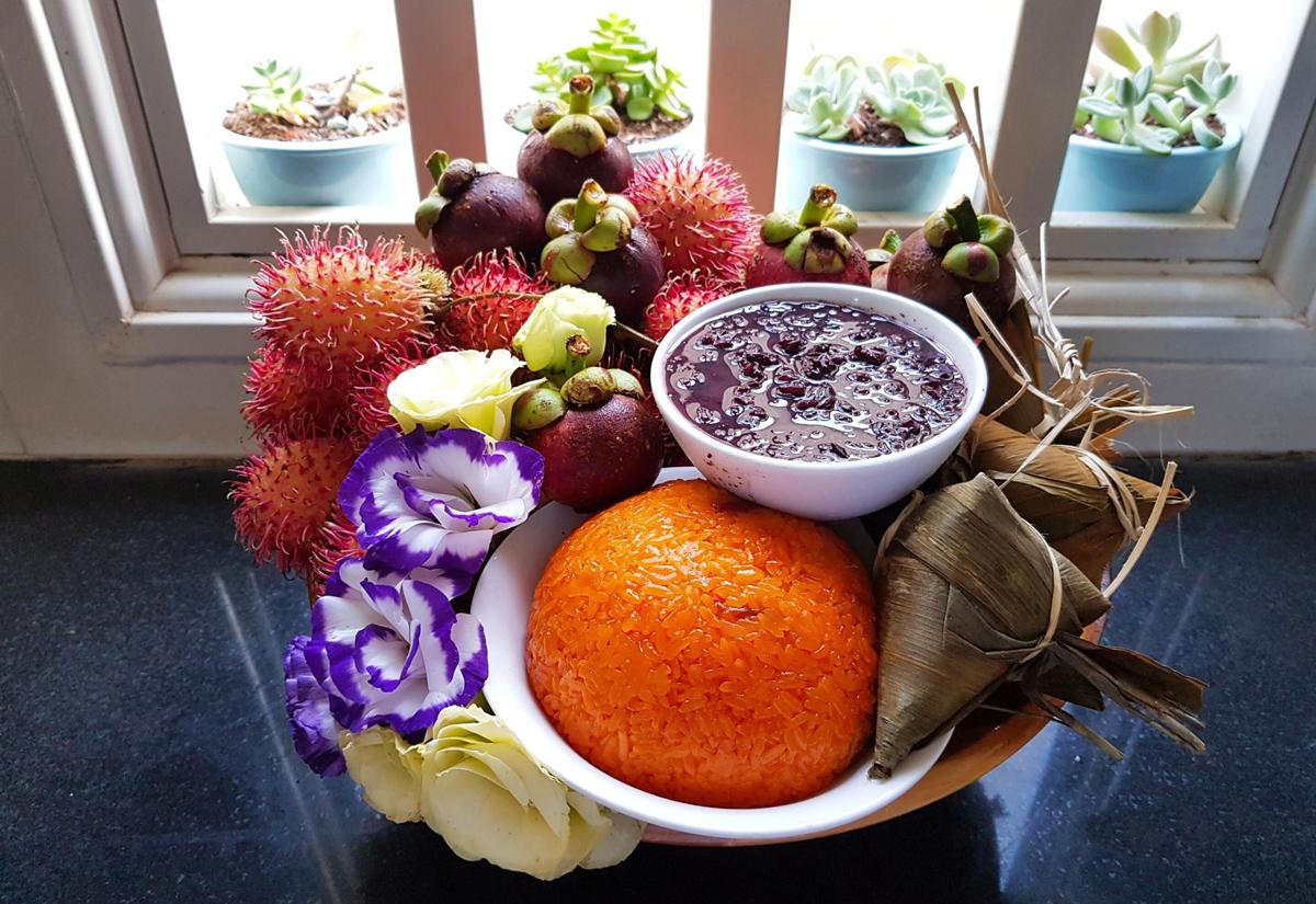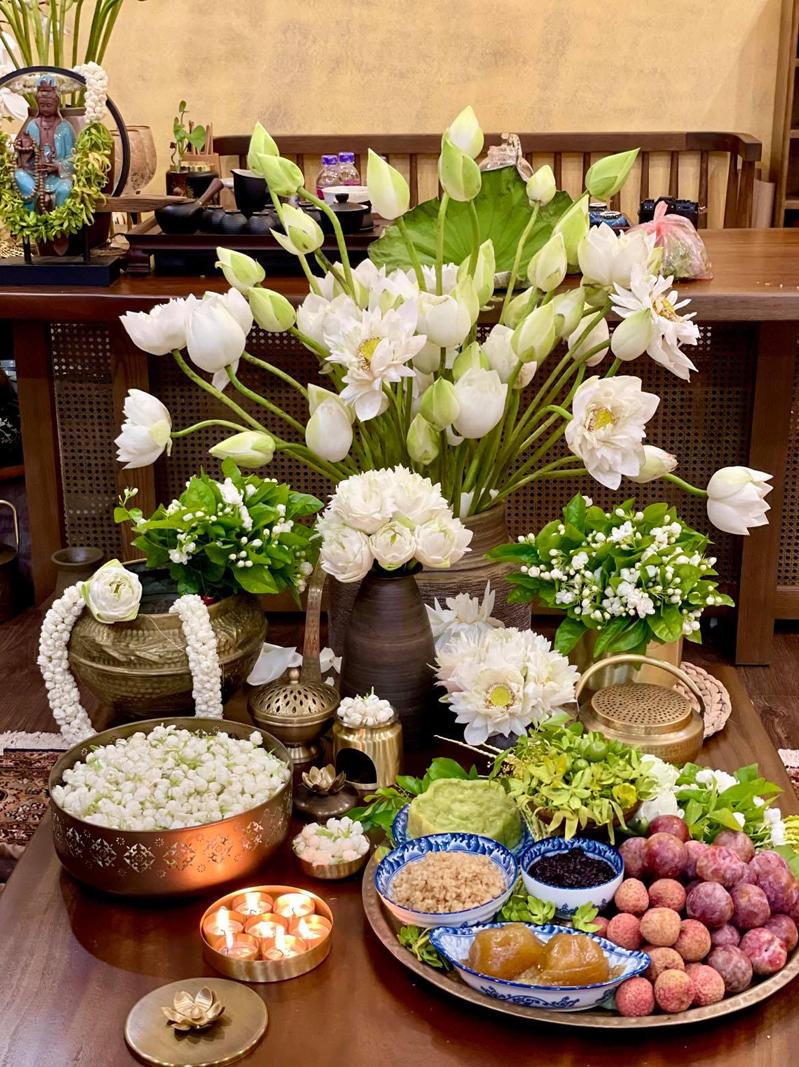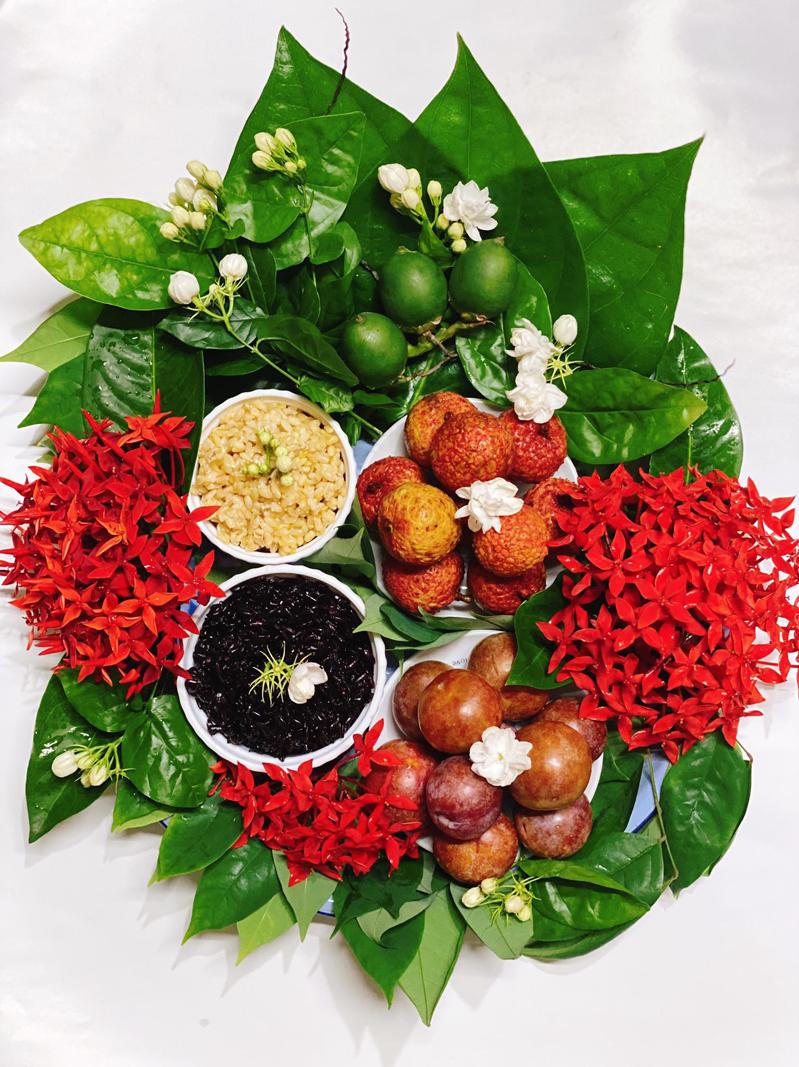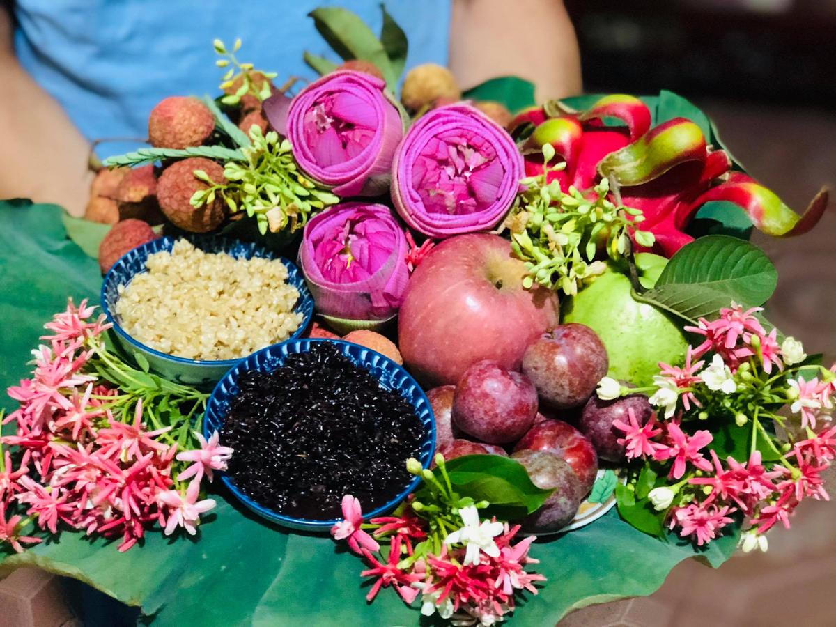 "Bây giờ khi đã lập gia đình mình vẫn giữ nếp đó cho gia đình nhỏ của mình. Sáng nay mình nấu nồi nước thơm lừng tắm cho các con và sau đó hạ mâm cỗ gồm có xôi gấc tự thổi, rượu nếp dì làm siêu ngọt, mua thêm bánh tro, các loại hoa, quả", chị chia sẻ.