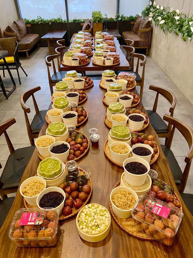 Sáng nay, chị Đoàn Phương Thảo ở Vạn Phúc (Hà Nội) dậy từ 5h sáng để sắp xong 25 mâm cỗ kịp gửi tặng người thân và bạn bè, thắp hương cúng Tết Đoan Ngọ trước lúc đi làm. Mỗi mâm có mận, vải, nếp cái (rượu nếp), xôi cốm, bánh ú tro và một giỏ hoa nhài thơm phức.