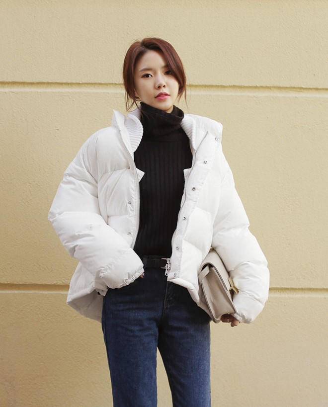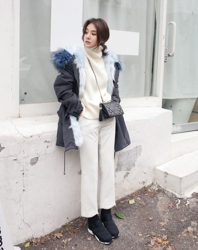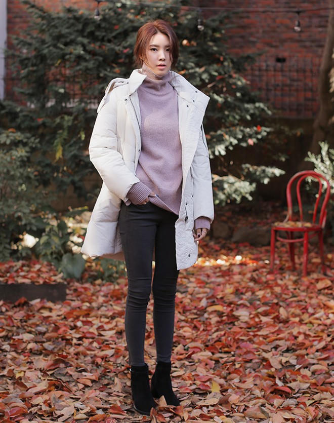 | Với những bạn gái thích phong cách điệu đà thì cách kết hợp đơn giản với quần skinny, áo len cao cổ rất được ưa thích. |