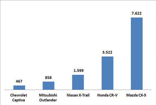 Mẫu xe lắp ráp và phân phối bởi Trường Hải nắm trong tay ưu thế lớn về giá, một trong những tiêu chí hàng đầu để đạt doanh số tốt. Thiết kế trung tính phù hợp khách hàng nam lẫn nữ giúp CX-5 phổ biến hơn đối thủ thuộc Honda. Phần còn lại của cuộc đua là những cái tên Nhật khác như Nissan X-Trail, Mitsubishi Outlander hay Hyundai Tucson (không công bố số liệu). Và mẫu xe từng tạo nên cơn sốt một thời, Chevrolet Captiva.