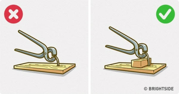 Nếu gặp khó khăn khi nhổ một chiếc đinh ra khỏi miếng gỗ, bạn hãy kê thêm một điểm tựa bên dưới chiếc kìm. Cách này sẽ giúp bạn lấy chiếc đinh ra một cách dễ dàng, không cần tốn sức.