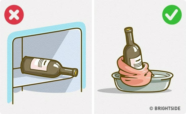 Bọc một chiếc khăn bên ngoài chai rượu rồi đặt bên trong thùng chứa nước lạnh hoặc đặt ngay dưới vòi nước lạnh khoảng 10 phút. Chai rượu sẽ được làm lạnh mà không cần dùng đá.