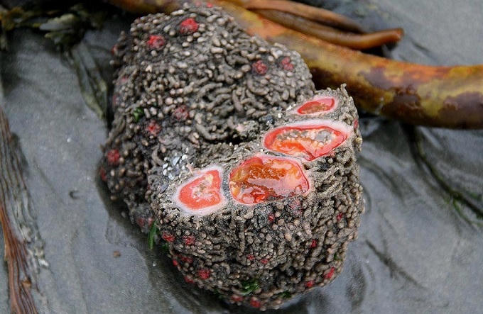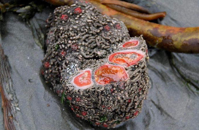 Piure: Loại động vật biển này có vỏ giống như san hô và phần trong giống như một cơ quan nội tạng, sinh sống nhiều ở bờ biển Chile và Peru. Phần bên trong có thể được ăn sống hoặc nấu chín. Nhiều người mô tả món này có vị như nhím biển. Ảnh: Reinoanimalia/Wikia.