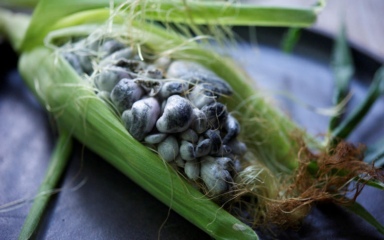 Huitlacoche: Đây là tên một loại bệnh khiến nấm mọc trên ngô. Hạt ngô mọc nấm được dùng làm bánh mì tortilla hay nấu súp. Ảnh: Glutton For Life.