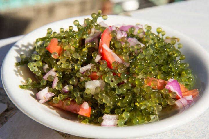 Lato (rong nho): Loại tảo biển này có hình dạng như một chùm nho xanh, có giá trị dinh dưỡng cao. Lato thường được dùng làm salad. Ảnh: Le Manger.