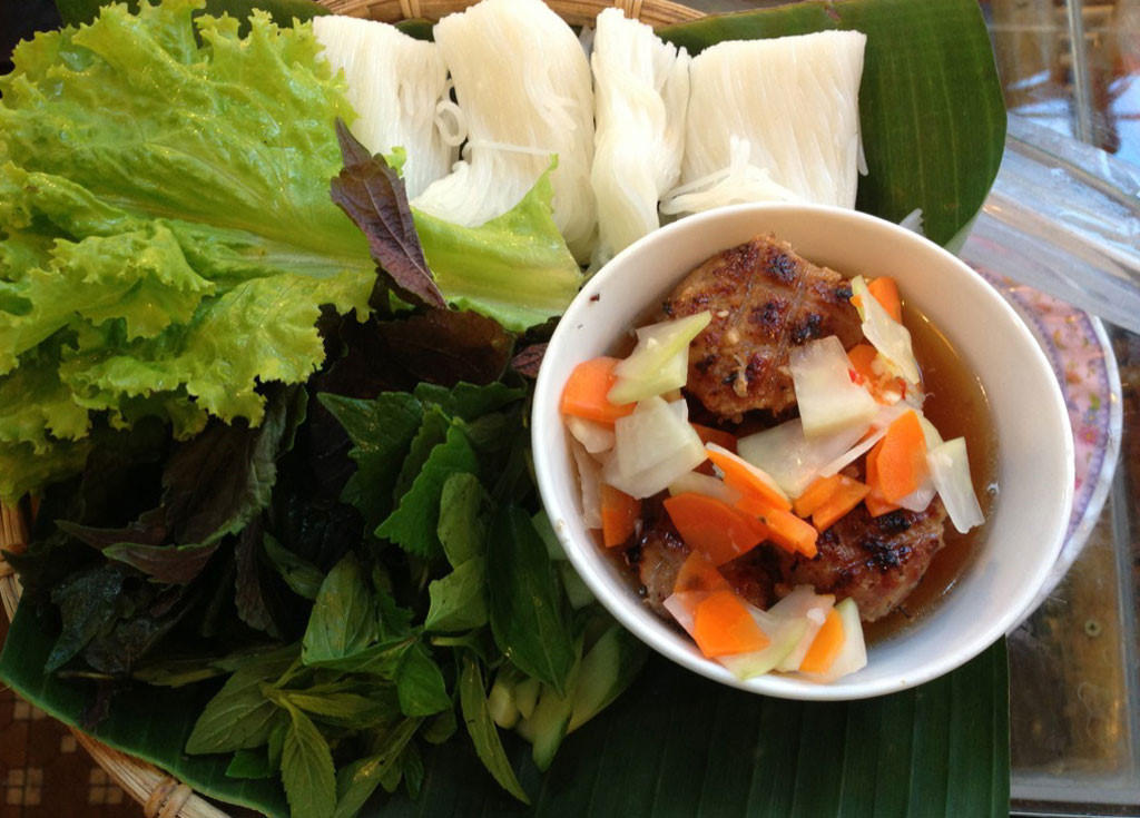 Thành phần cơ bản vẫn là bún, thịt và chả nướng đựng trong một chiếc tô chiết yêu với nước mắm pha loãng, có thả vào lát đu đủ, cà rốt bào mỏng, thêm lát ớt đỏ lửng lơ phía trên vô cùng đẹp mắt. Thịt nướng màu cánh gián, tô nước mắm nâu có điểm xuyết màu trắng cam, đỏ trên chiếc mâm có đĩa bún trắng và rổ rau xanh, đủ sắc đủ hương và đủ vị để thèm, ăn một mâm còn muốn thêm phần nữa.