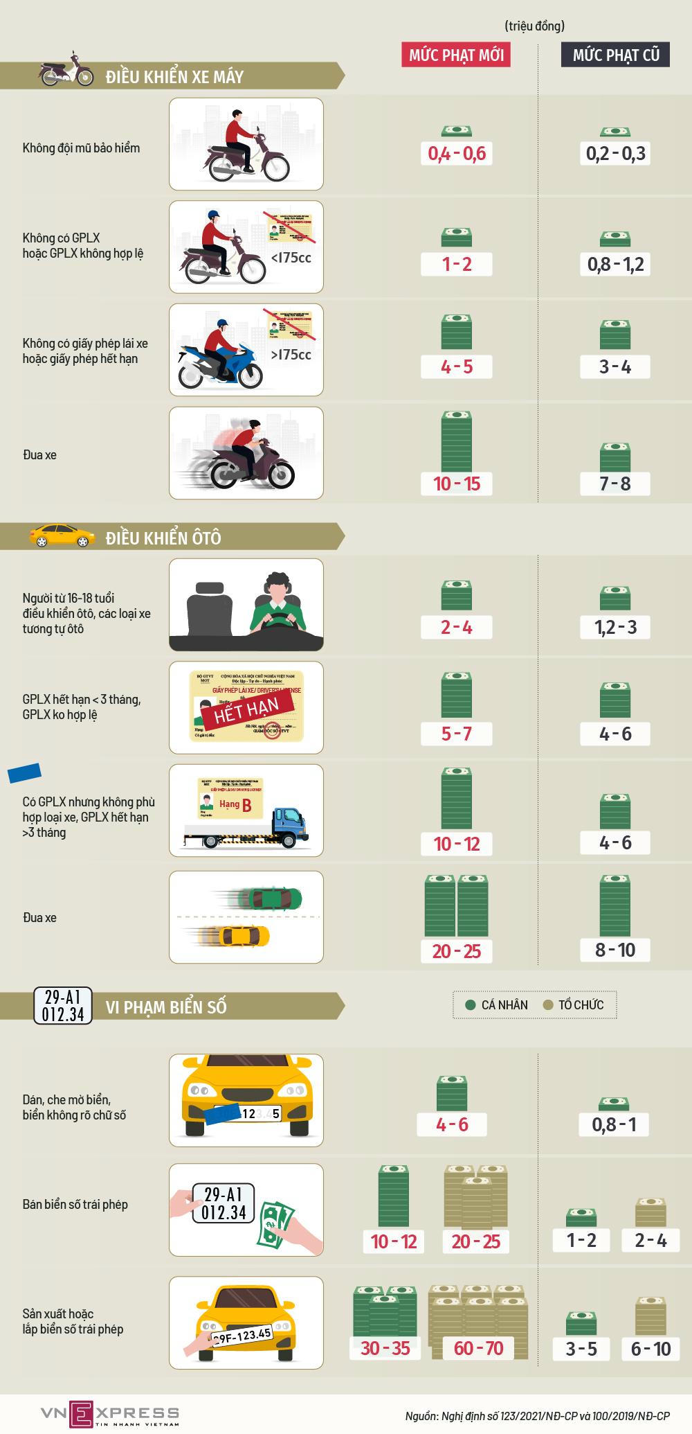 Những mức phạt vi phạm giao thông tăng mạnh từ tháng 1/2022 Người đi xe máy không đội mũ bảo hiểm bị phạt gấp đôi, trong khi lắp biển số trái phép bị tăng mức phạt gấp 10 lần. Thứ Ba 04/01/2022 21:09 (GMT+7) Tạ Lư - Lương Dũng/ VnExpress