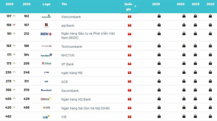 Theo đó, 12 ngân hàng của Việt Nam lọt Top 500 thương hiệu ngân hàng giá trị nhất của Brand Finanance gồm: Vietcombank (137), Agribank (159), BIDV (161), Techcombank (163), VietinBank (171), VPBank (173), MB (230), ACB (273), Sacombank (354), HDBank (400), SHB (420) và VIB (492).