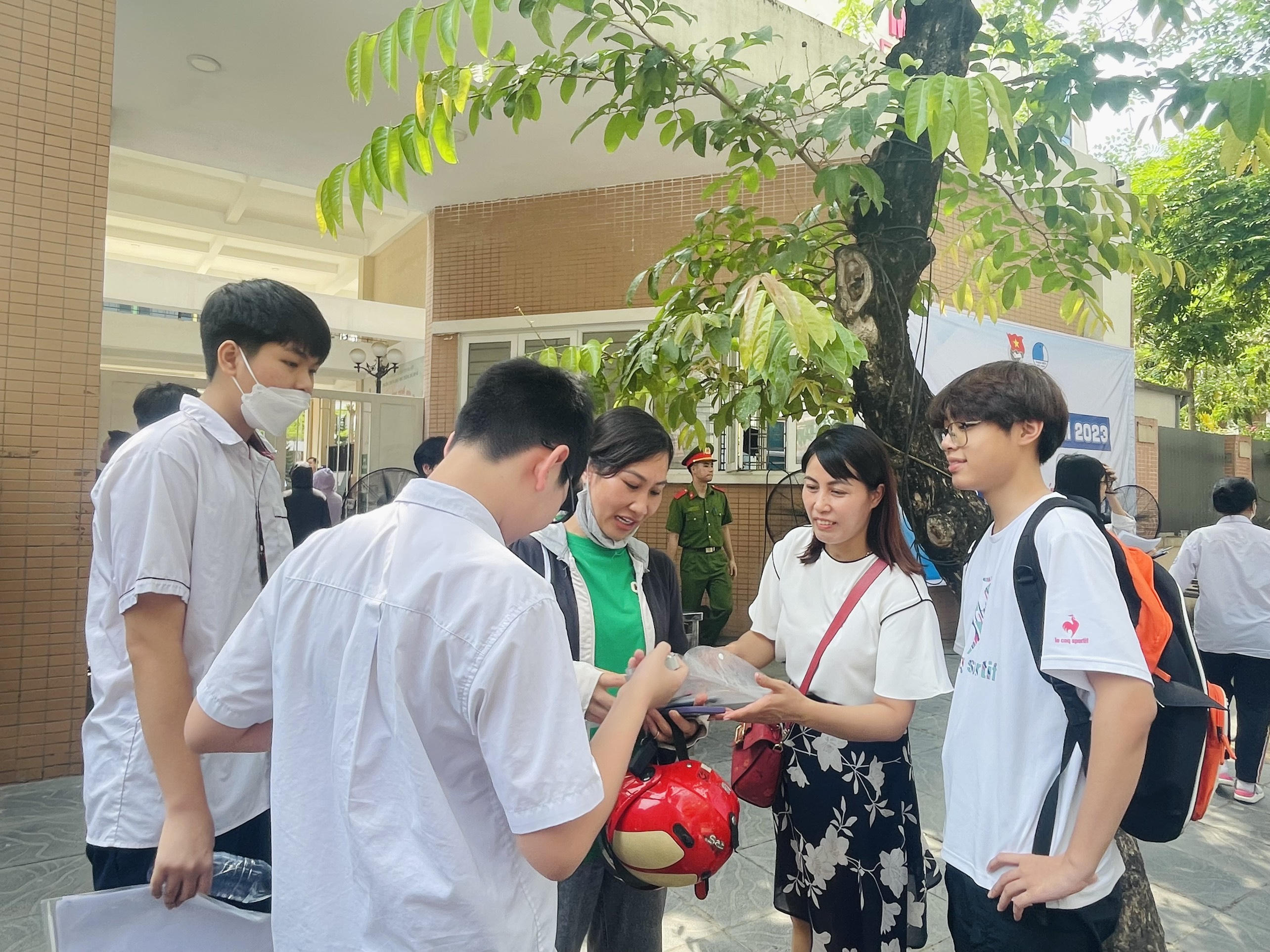 Phụ huynh có mặt từ sớm, đứng dưới nắng chờ thí sinh ra khỏi phòng thi. |