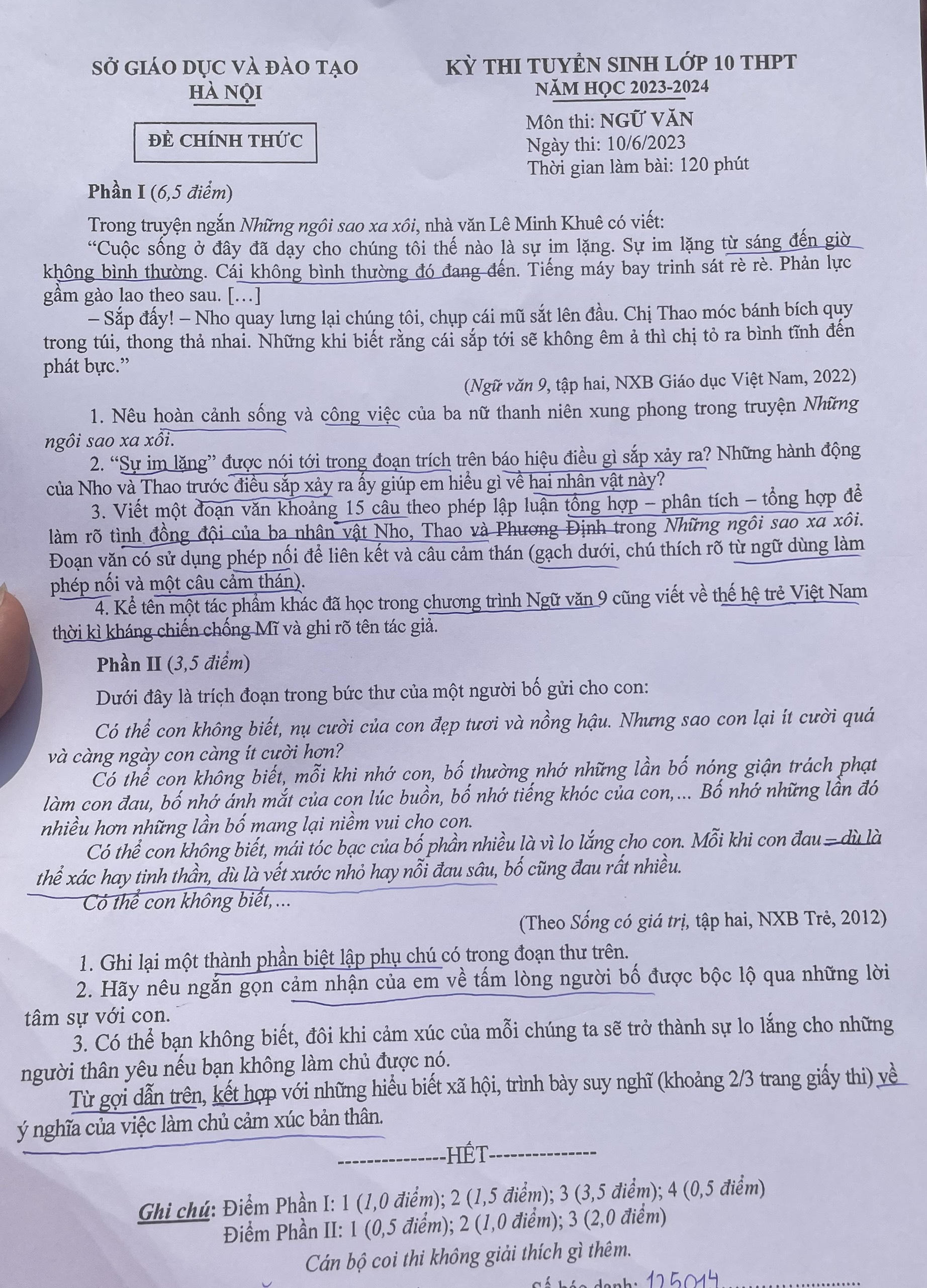 Về đề thi, phần nghị luận văn học nói về tác phẩm "Những ngôi sao xa xôi" của nhà văn Lê Minh Khuê. Trước đó, Trường THPT chuyên Khoa học Xã hội và Nhân văn cũng lựa chọn tác phẩm này để đưa vào đề thi năm nay.