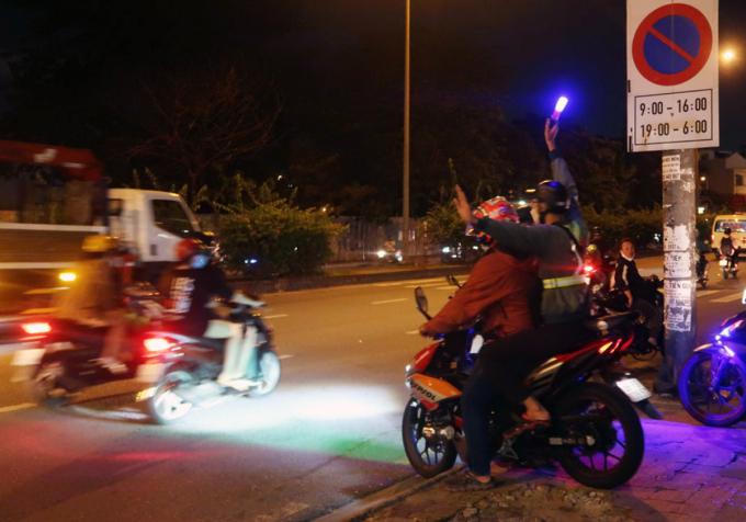 Nhóm Hỗ trợ cấp cứu TP HCM đang dẫn đường cho một xe cấp cứu đến Bệnh viện Nhi đồng 1, tối 9/5. Ảnh: Tuệ Minh.
