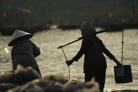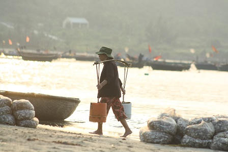 Những chiếc thúng chở đầy tôm cá được những người đàn ông quẩy vào bờ một cách nhẹ nhàng. Những người phụ nữ nhanh chân đến xách những túi cá lên bờ. Ở chợ cá có đủ những người làm thuê với các công việc như phân loại cá, người làm cá bóc vỏ tôm, người đi bê cá, nhưng có lẽ đặc biệt hơn cả là nghề gánh nước biển thuê của những người phụ nữ đã ở tuổi xế chiều.