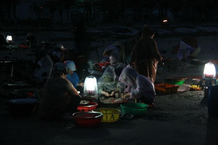 Những ngõ xóm vẫn vắng lặng trong giấc ngủ sâu, chỉ khi ra đến đường Hoàng Sa (đại lộ dọc bãi biển Đà Nẵng), khách lạ mới thấy ngày mới của một góc thành phố này đã bắt đầu từ bao giờ. Bờ biển dài với những bóng người đứng, ngồi, đi lại. Không gian đêm bỗng trở nên nhộn nhịp trước mắt những vị khách phương xa như tôi. Tiếng gọi nhau í ới, tiếng sóng biển vẫn dạt dào vỗ đều, đan xen với tiếng máy của những con tàu đang cập bến, chợ cá cũng bắt đầu.