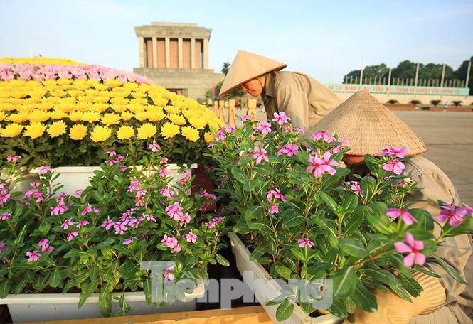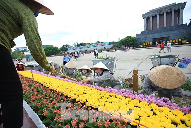 Trước những ngày lễ trọng đại của đất nước, những công nhân vẫn âm thầm lặng lẽ tô điểm thêm những bông hoa đẹp tại chân cột cờ tại quảng trường Ba Đình