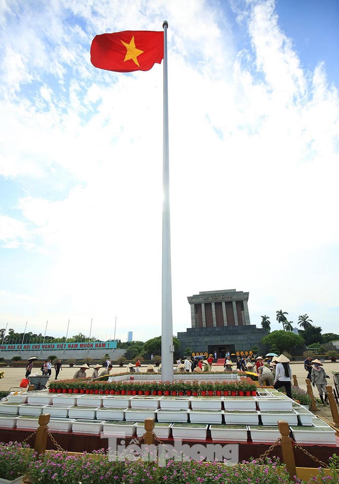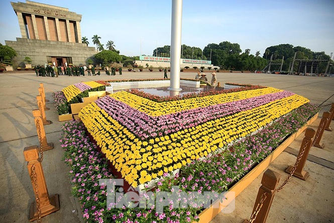 Gần 8000 bông hoa được cắm theo hàng quanh khu vực cột cờ trước Lăng Bác trang trí cho ngày lễ 2/9/2019