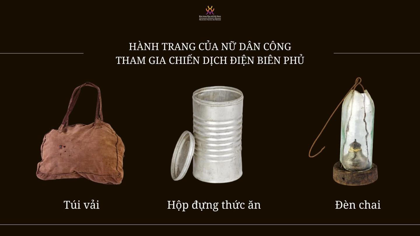 Trong Chiến dịch Điện Biên Phủ, những nữ dân công dù không trực tiếp cầm súng nhưng họ đã miệt mài gánh gồng những tải gạo, lương thực, vật dụng cần thiết ra chiến trường. Hành trang mang theo bên mình là những vật dụng đơn sơ mộc mạc hàng ngày như túi vải đựng đồ cá nhân, chiếc hộp đựng thức ăn hay chiếc đèn chai tự tạo... đã là người bạn đồng hành cùng họ trên những cung đường, vượt qua mưa bom bão đạn của quân thù.