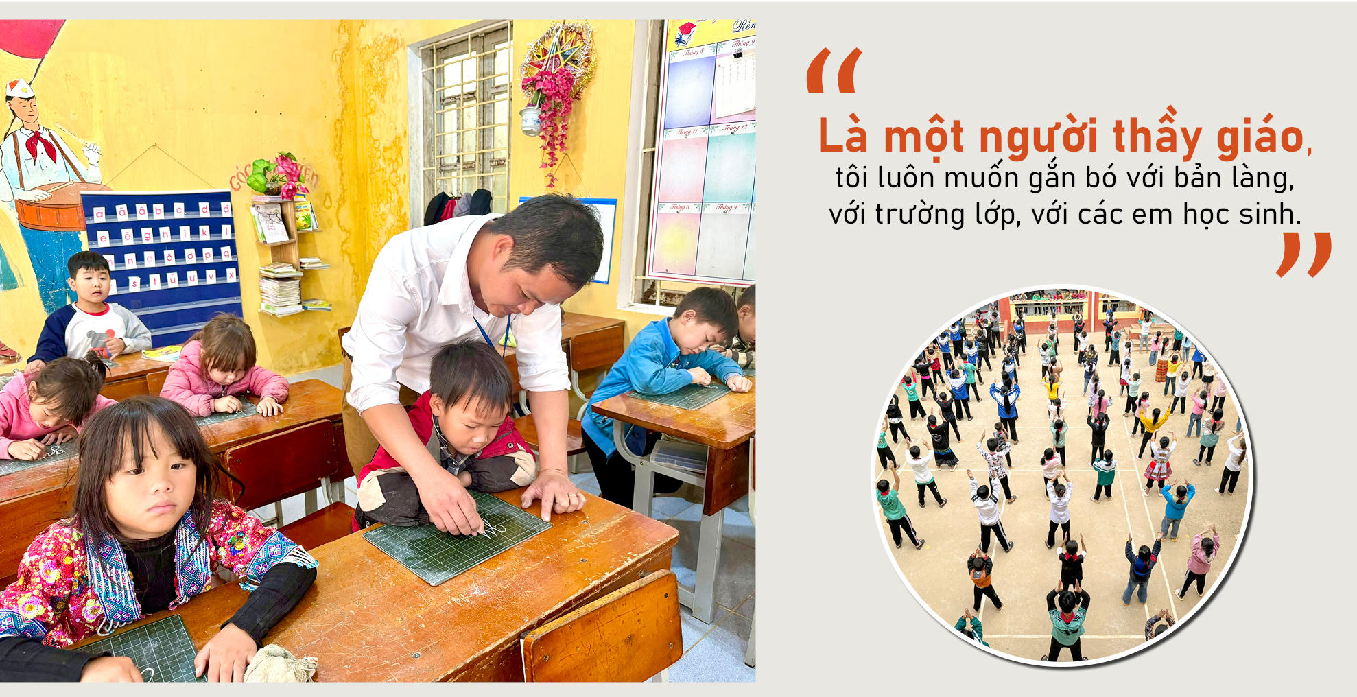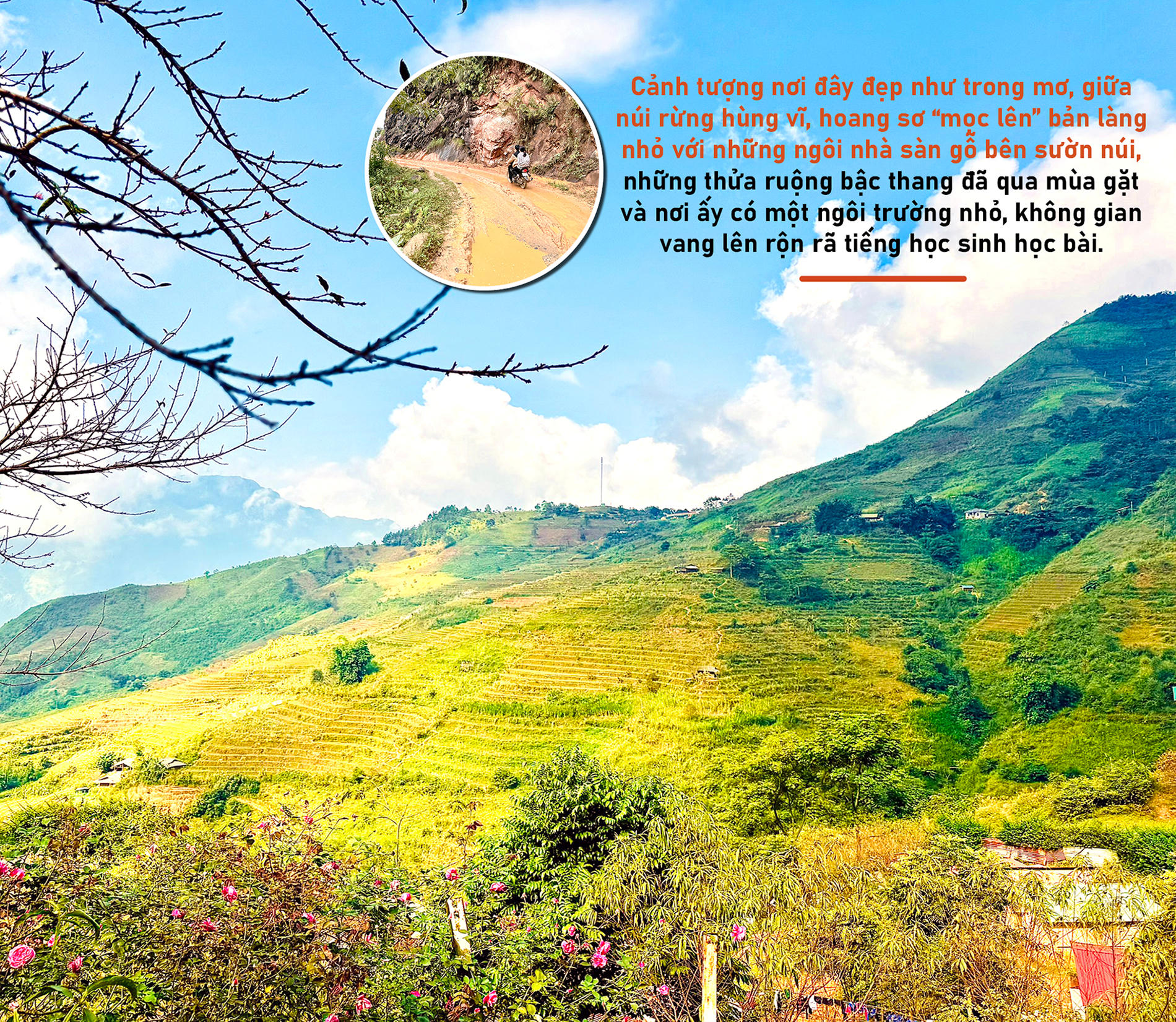 Cảnh tượng nơi đây đẹp như trong mơ, giữa núi rừng hùng vĩ, hoang sơ “mọc lên” bản làng nhỏ với những ngôi nhà sàn gỗ bên sườn núi, những thửa ruộng bậc thang đã qua mùa gặt và nơi ấy có một ngôi trường nhỏ, không gian vang lên rộn rã tiếng học sinh học bài. Vừa đưa chúng tôi đến nơi, các thầy giáo lại vội vã vào lớp để bắt đầu tiết dạy học của mình...