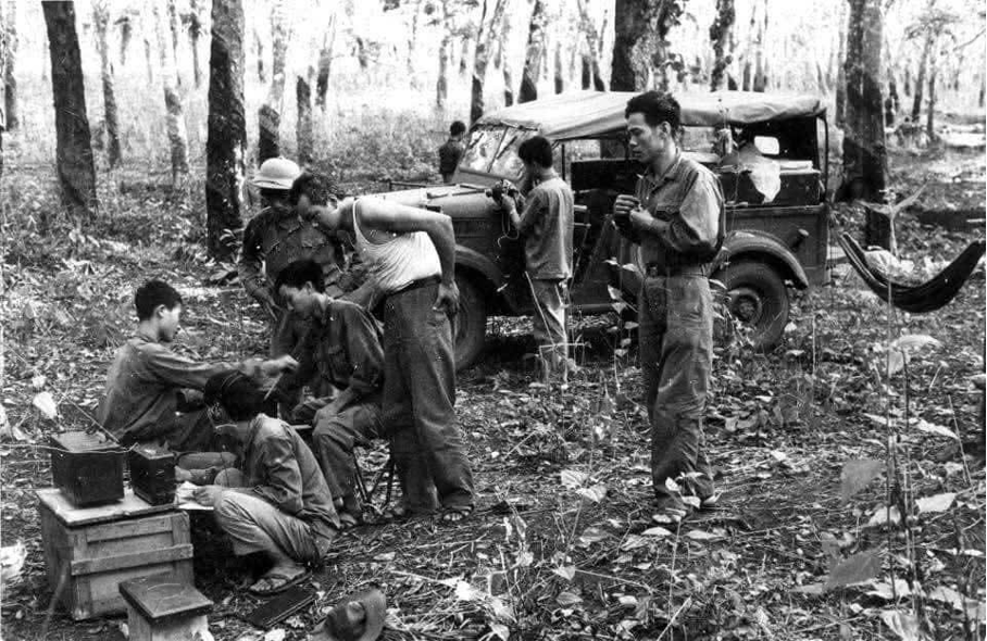 Nhà báo Trần Mai Hưởng cùng các phóng viên chiến trường TTXVN trên đường vào mặt trận, dừng chân trong rừng Trường Sơn. Ảnh: Tư liệu (TTXVN) |