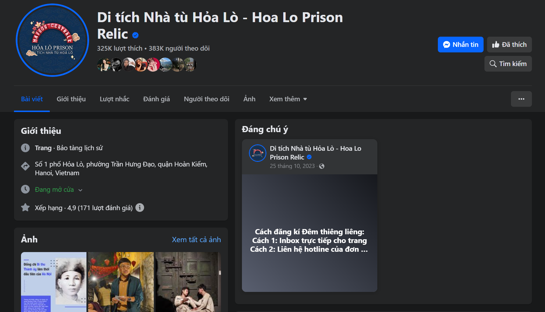 Đến nay, Fanpage Di tích Nhà tù Hỏa Lò - Hoa Lo Prison Relic (có dấu tích xanh), có gần 400 nghìn người theo dõi và hơn 300 nghìn lượt thích.
