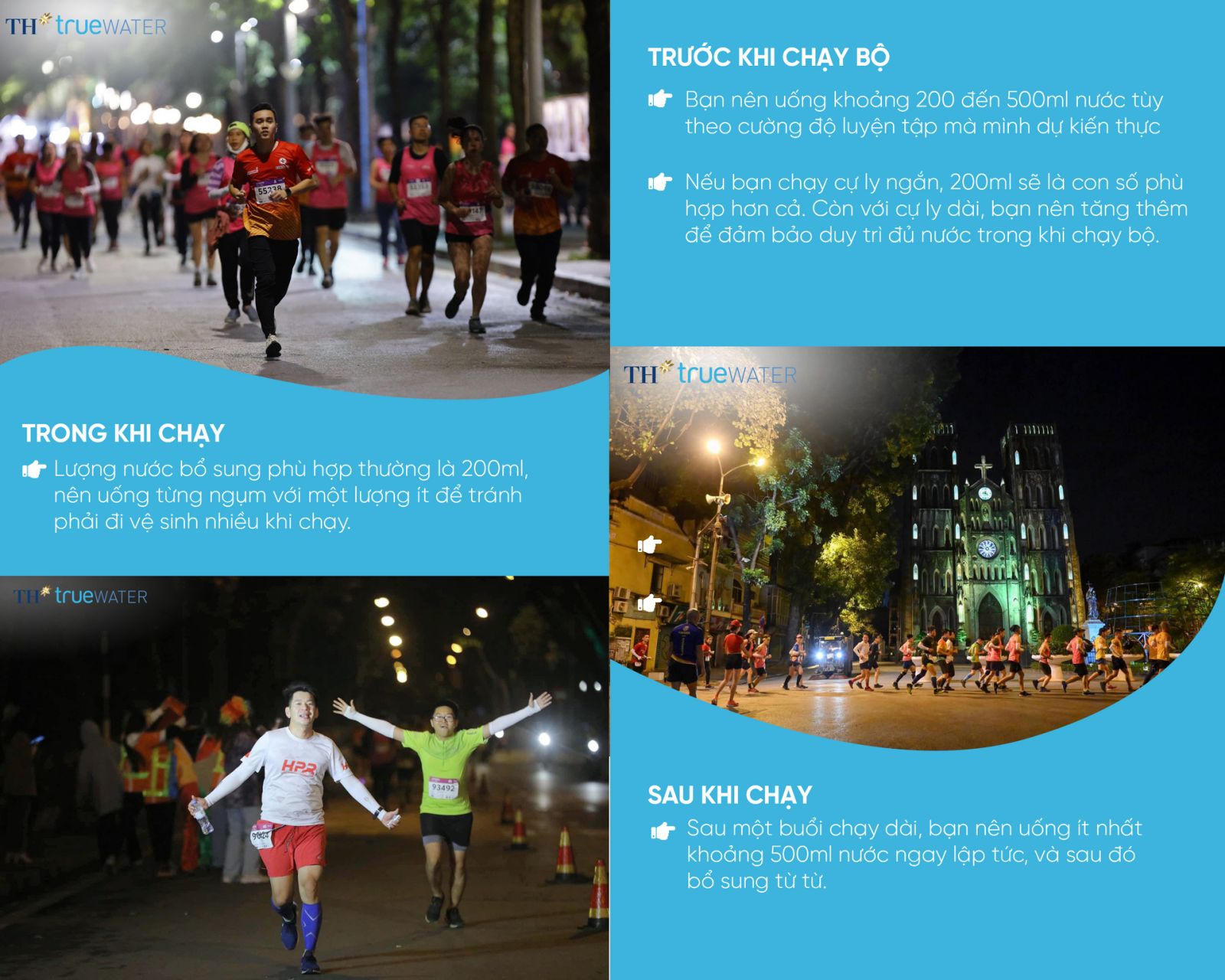 Hiểu được tầm quan trọng của nước đối với cơ thể cũng như mong muốn được tiếp thêm sức mạnh cho các tín đồ chạy bộ, Tập đoàn TH cùng sản phẩm TH true WATER đã đồng hành với hàng loạt sự kiện chạy bộ thu hút đông đảo những người yêu thể thao, vận động và thực hành lối sống lành mạnh như giải Long Biên Marathon, Mekong Delta Marathon, VnExpress Hanoi Midnight,... Được biết, TH true WATER là sản phẩm nước tinh khiết hoàn toàn từ mạch ngầm núi lửa triệu năm quý hiếm và tốt cho sức khỏe.