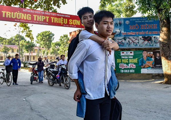 Trong mùa thi Đại học năm nay, hình ảnh cặp bạn thân Nguyễn Tất Minh và Ngô Minh Hiếu (cựu học sinh lớp 12, Trường THPT Triệu Sơn 5, huyện Triệu Sơn, Thanh Hóa) khiến không ít người xúc động. 10 năm qua, Minh Hiếu thường xuyên cõng người bạn kém may mắn của mình đến trường.