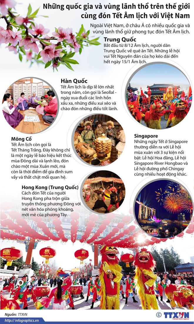 Ngoài Việt Nam, ở châu Á có nhiều quốc gia và vùng lãnh thổ như Trung Quốc, Hàn Quốc, Mông Cổ, Singapore cùng giữ phong tục đón Tết Âm lịch.