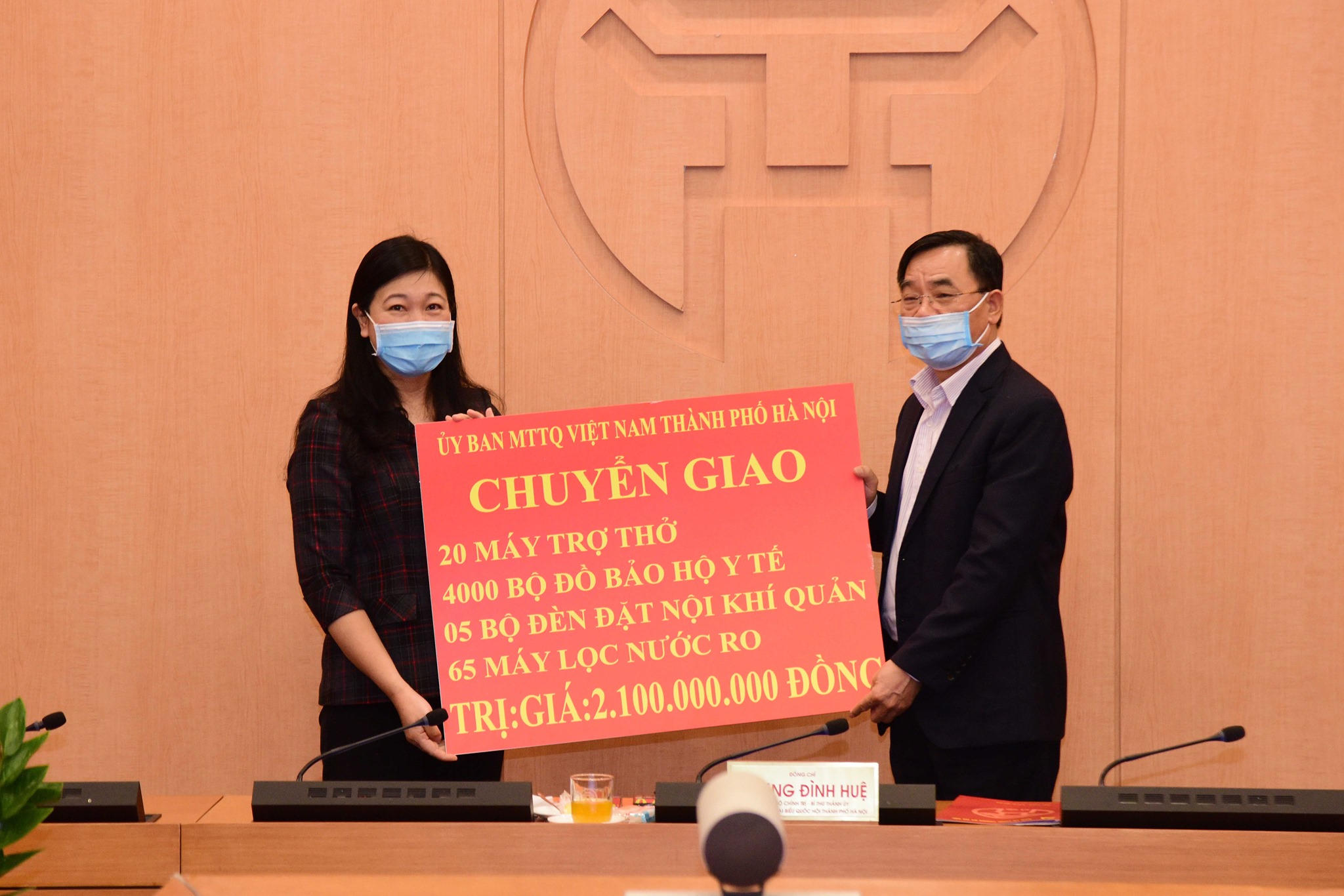 Tại phiên họp, Ủy ban MTTQ Việt Nam TP Hà Nội đã trao tặng, chuyển giao quà ủng hộ từ các tổ chức và cá nhân cho TP bao gồm: 20 máy thở; 40.000 bộ đồ bảo hộ y tế; 5 bộ đèn đặt nội khí quản; 65 máy lọc nước RO trị giá 2,1 tỷ đồng.