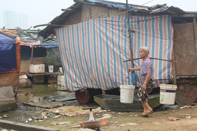 Ghé nơi sinh sống chị Nguyễn Thị Th (sinh năm 1963, quê Hải Phòng) ở bãi nổi sông Hồng, chúng tôi không khỏi ái ngại khi thấy chị múc nước ngay dưới thuyền để rửa thức ăn và chậu nước sạch dành cho lần rửa cuối cùng.