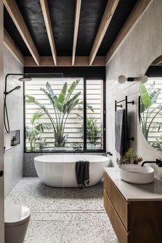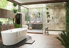 Không hoàn toàn lộ thiên, nhưng thiết kế phòng tắm này cũng tận hưởng đầy đủ nắng gió, đặc biệt là hệ thống cây xanh khiến chủ nhân của nó luôn có cảm giác đang đắm mình trong thiên nhiên khoáng đạt. |