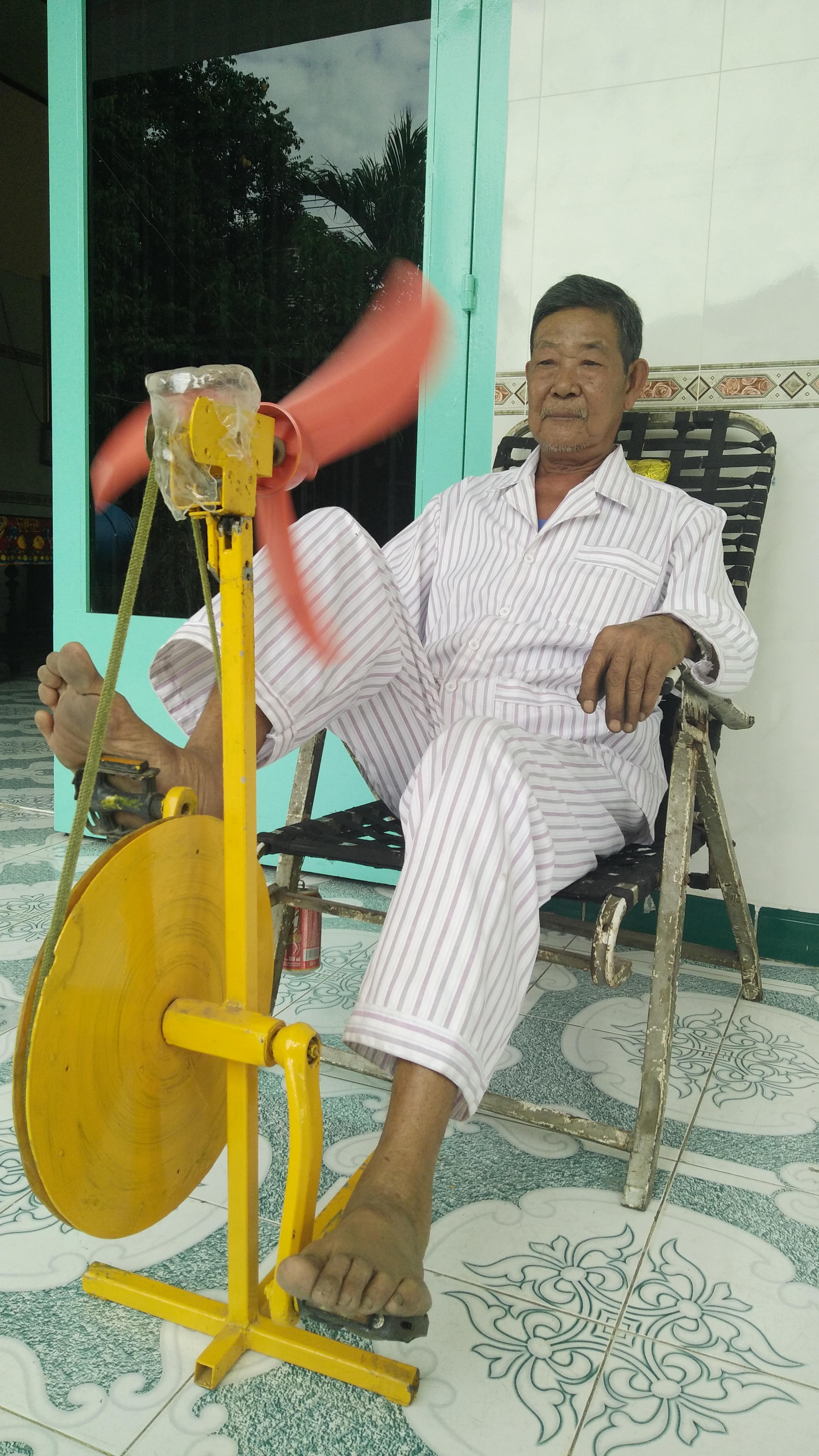 “Tui bị bệnh thoái hóa khớp gối, đi lại khó khăn, phải điều trị và tập vật lí trị liệu. Nằm nhà, tui mới nghĩ ra cách chế tạo một chiếc máy đạp tập cho đôi chân. Nó giống như mấy chiếc máy ở trong phòng tập thể hình, sử dụng hai chân đạp. Đạp máy một thời gian, tui lại nghĩ “sao mình không tìm cách nào đó vừa đạp vừa thư giãn”. Thế là bắt đầu tìm hiểu nguyên lí để gắn cánh quạt vào. Mình vừa tập, vừa được mát, một công đôi chuyện”, ông Tám Rô kể.