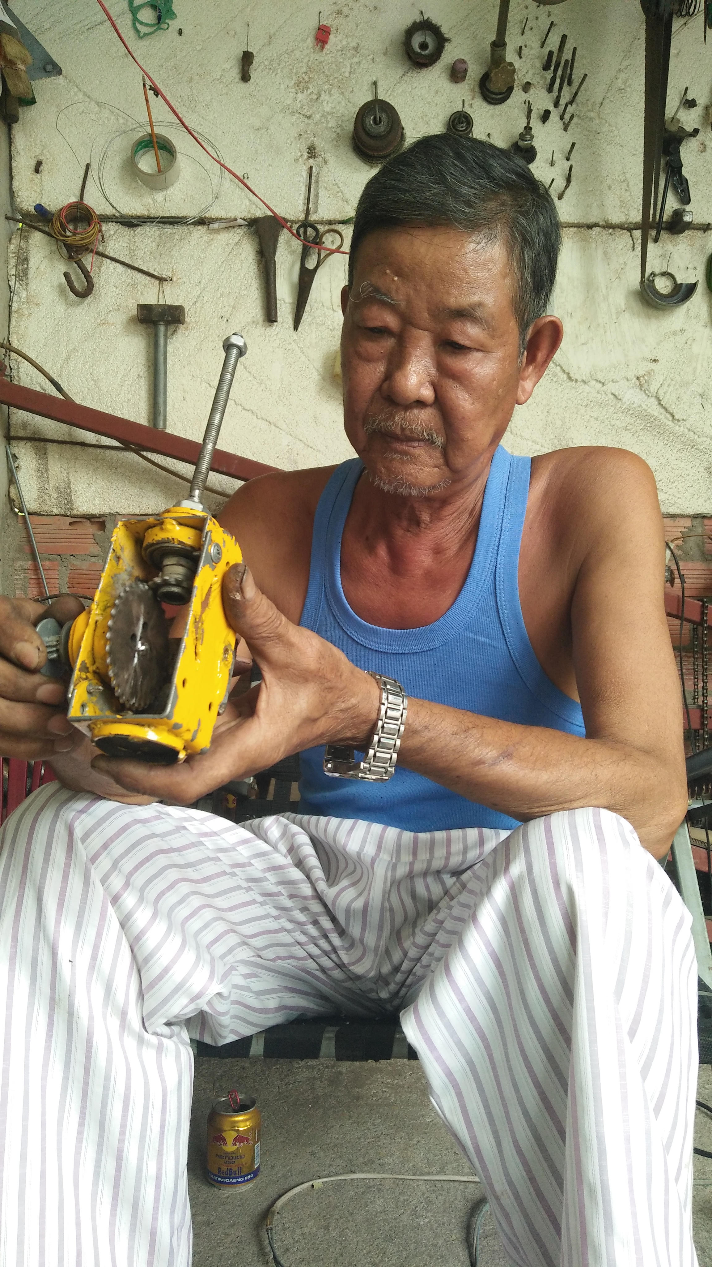 Phía sau tiệm tạp hóa của người con trai út, ông Tám Rô sử dụng làm “thủ phủ” của những sáng chế của mình. Dụng cụ từ máy cưa, máy hàn, máy cắt, ốc vít, kiềm, cà lê... ông Tám Rô sắm đầy đủ để phục vụ cho những ý tưởng của mình.