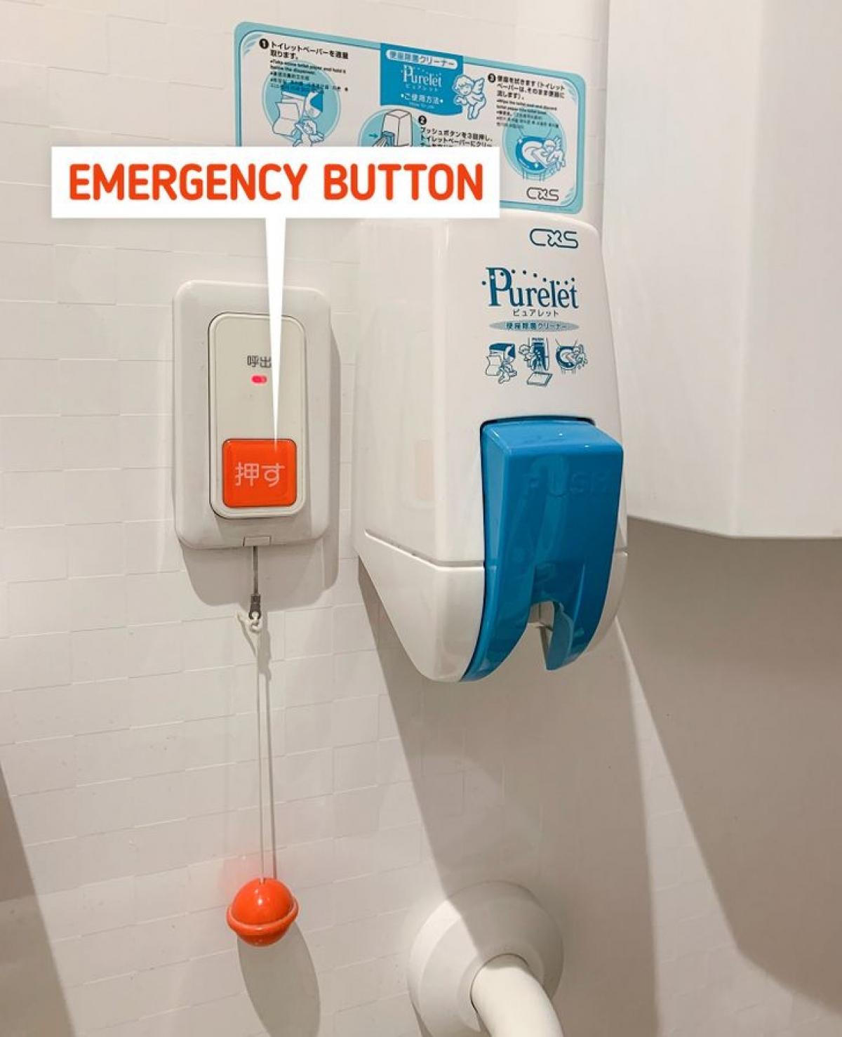 Các nhà vệ sinh tại Nhật Bản được bố trí các nút bấm khẩn cấp. Điều này được cho là để thích nghi với một dân số đang già hóa nhanh chóng. Nút bấm khẩn cấp được bố trí sẽ giúp lực lượng chức năng hành động kịp thời nếu các công dân lớn tuổi cần trợ giúp khẩn cấp khi sử dụng toilet. Tuy nhiên, điều này cũng đôi khi gây phiền phức cho du khách nước ngoài đến Nhật Bản; vì không đọc được tiếng Nhật, họ vô tình ấn nhầm nút gọi hỗ trợ khẩn cấp và có thể có cuộc gặp không mong đợi với các lực lượng chức năng bên ngoài toilet.